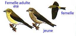 Femelle : ressemble à la femelle du bruant jaune mais en jaune plus pâle et croupion gris-brun