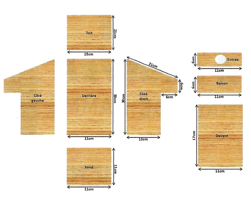 superficie interne du nichoir est de 121 cm2 soit un carré de 11 cm x 11 cm.